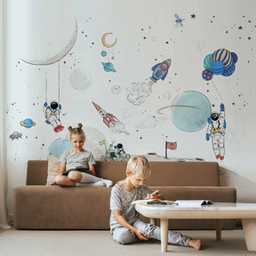 Breng sfeer in je interieur met dit bijzondere muurschildering behang, ontworpen door Annet Weelink Design. Elk detail is met de hand getekend en daarna zorgvuldig gedrukt op hoogwaardig behangmateriaal. Het resultaat is een unieke eyecatcher die je ruimte direct een stijlvolle en persoonlijke uitstraling geeft. Met astronauten, sterren en de maan is deze speciaal voor de kleine astronauten.