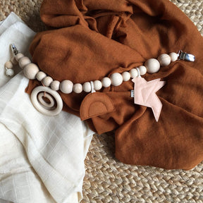 Maar het speelgoed moet ook toelaten om rustig te kunnen slapen. De kleuren en vormen die we gebruiken en het serene geluid van rammelend hout sluiten hierop aan.