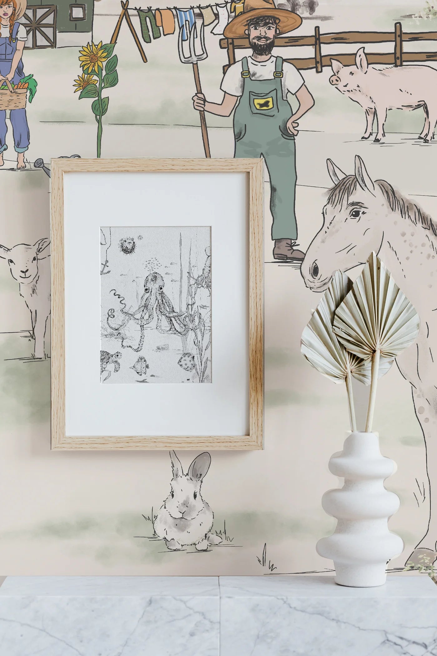 Breng sfeer in je interieur met dit bijzondere muurschildering behang, ontworpen door Annet Weelink Design. Elk detail is met de hand getekend en daarna zorgvuldig gedrukt op hoogwaardig behangmateriaal. Het resultaat is een unieke eyecatcher die je ruimte direct een stijlvolle en persoonlijke uitstraling geeft. Het behang met schattige boerderijdieren een een tractor is speciaal ontworpen voor boerderijliefhebbers.