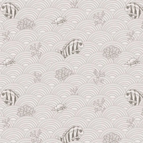De kleuren van het Fishy waves babykamer behang zijn grijs met een hele licht wittint als achtergrond.