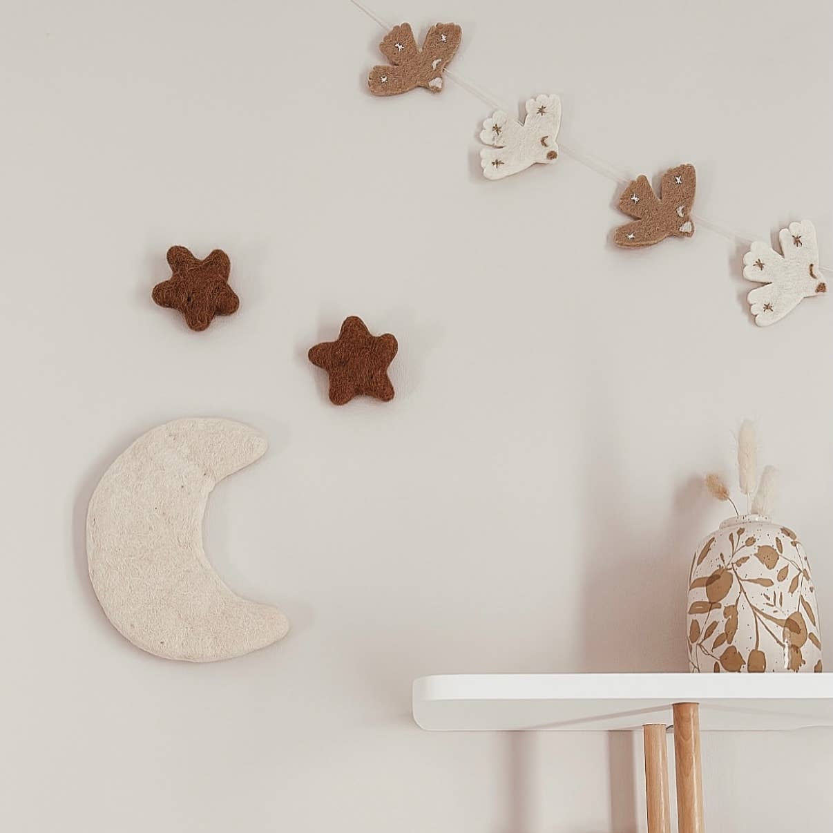 Diese Girlande aus Filzvögeln verleiht jedem Kinderzimmer eine sanfte und beruhigende Atmosphäre. Die natürlichen Farben Beige und Weiß sorgen für einen hellen und zeitlosen Look. Sie sieht wunderschön an der Wand, am Regal oder am Türgriff aus.